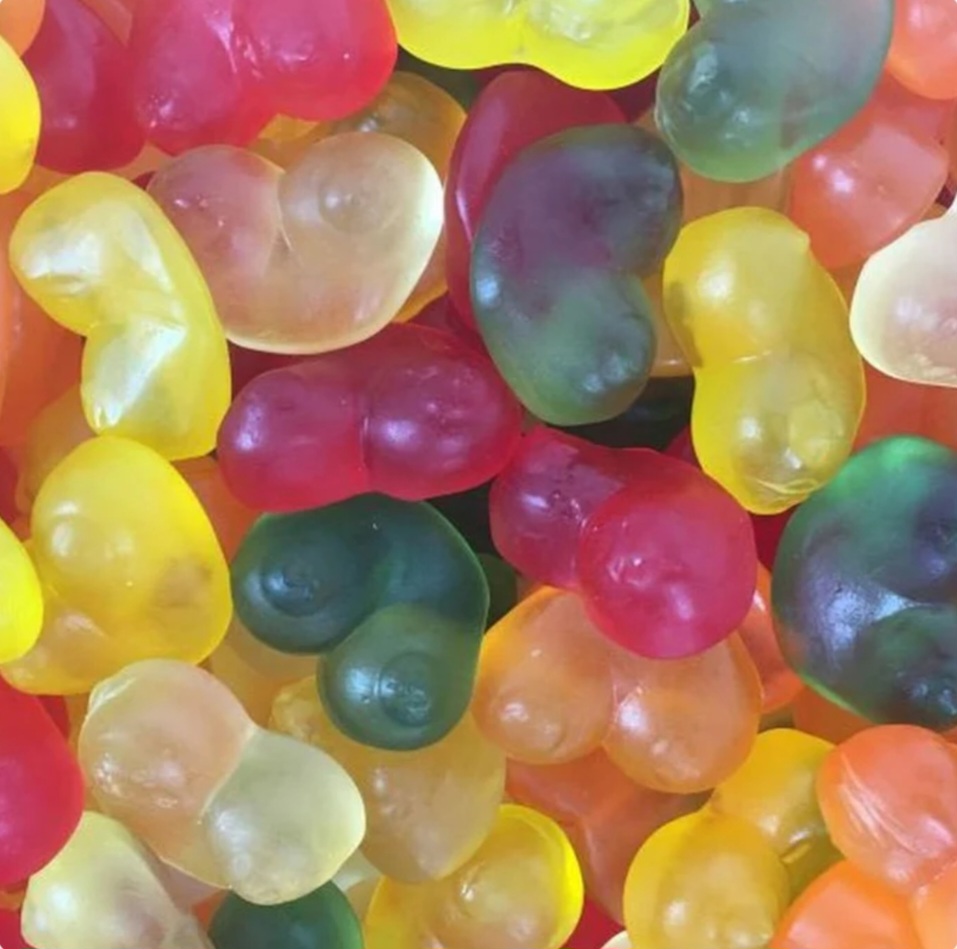 • Formato: Estas gomas têm um formato único e humorístico de seios femininos.
