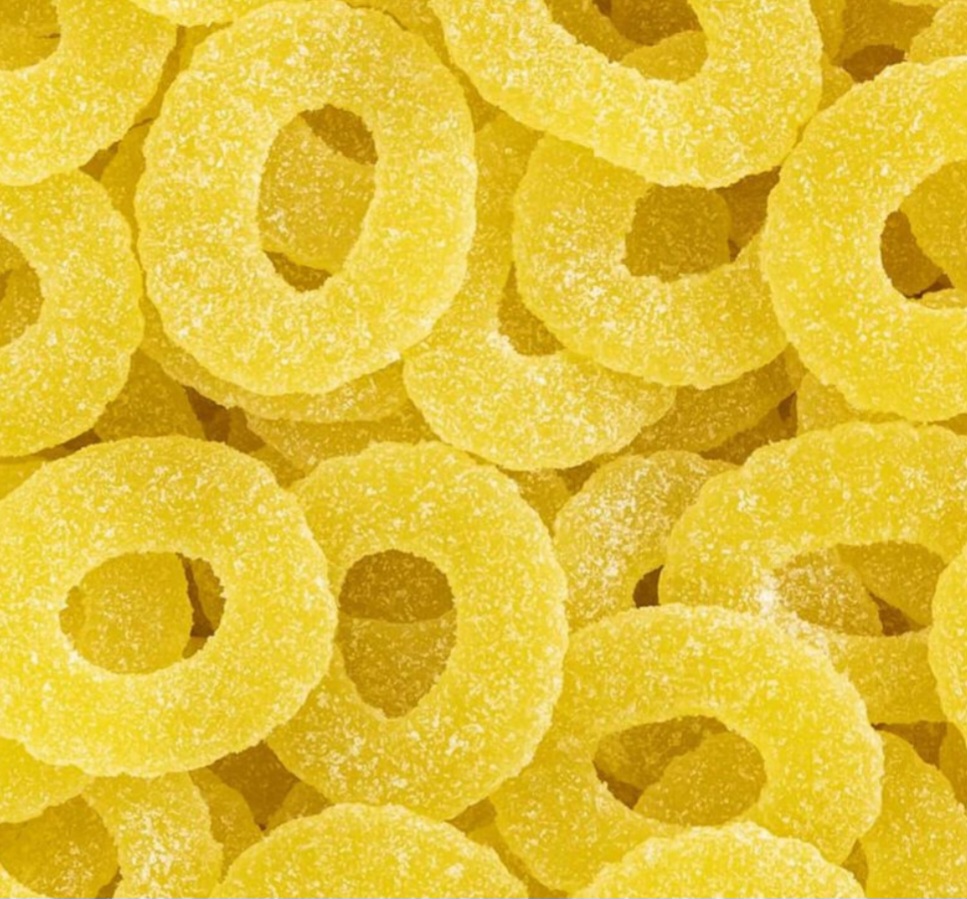 Gomas em formato de fatia de abacaxi  com uma cobertura de açúcar doce e sabor natural de abacaxi. Ideal para os amantes de abacaxi.  Garantimos que seu sabor intenso não o deixará indiferente.